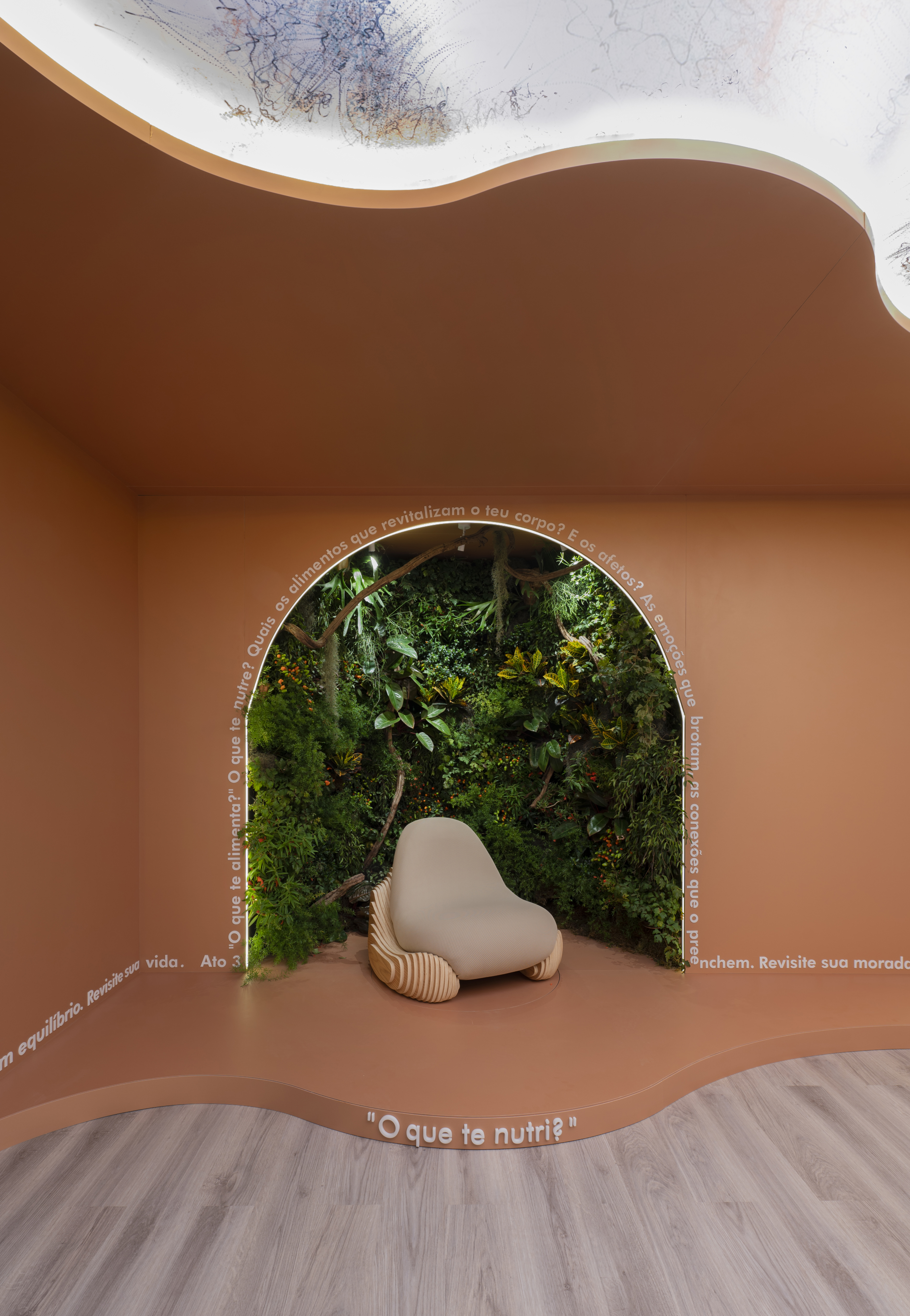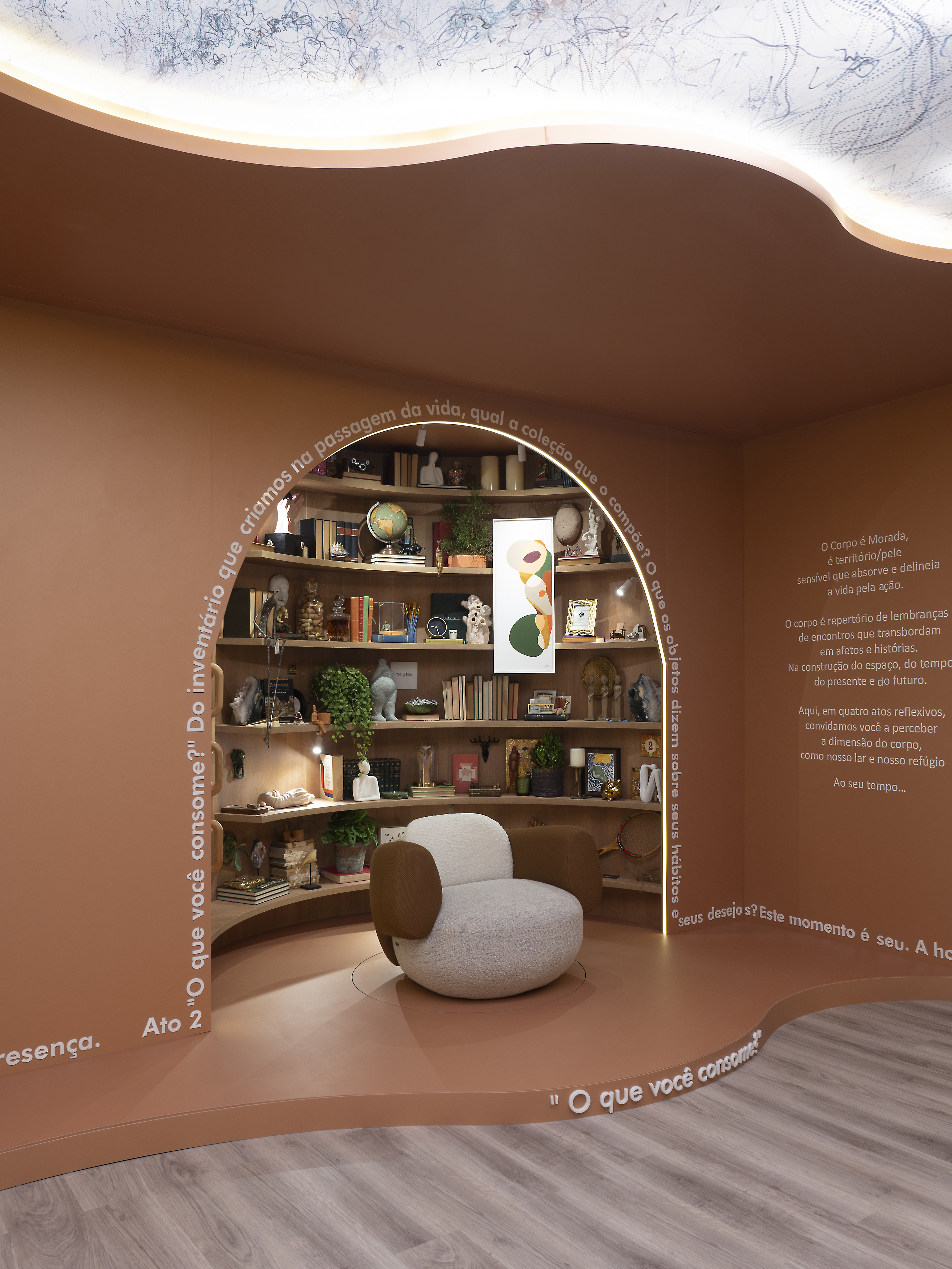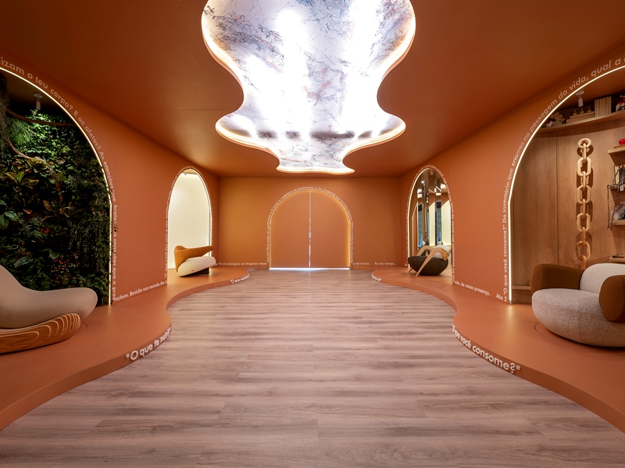 Como uma instalação artística, a arquiteta cobriu o espaço praticamente de uma única cor, a Moeda de Cobre, das Tintas Coral, e direcionou as formas orgânicas de MDF da Sudati criando o que ela batizou de Quatro Atos Reflexivos - no teto, uma obra assinada pelo artista gráfico Felipe Braum. Em cada um destes cantos dentro do ambiente, o visitante, de forma interativa sentado nas poltronas do designer Mauricio Bomfim, é levado a se perguntar e a observar questões inerentes a praticamente todos os seres humanos.