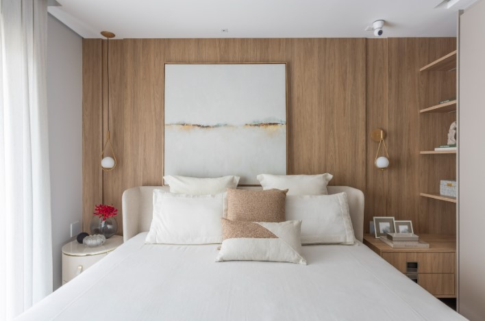 Segundo a profissional, um dos pontos centrais para o conforto é investir em uma cabeceira bem dimensionada e revestida com tecido, que além de funcional, agrega charme e elegância. Complementar o espaço com almofadas de diferentes tamanhos e texturas reforça a sensação de maciez e aconchego, tornando o ambiente ainda mais convidativo.