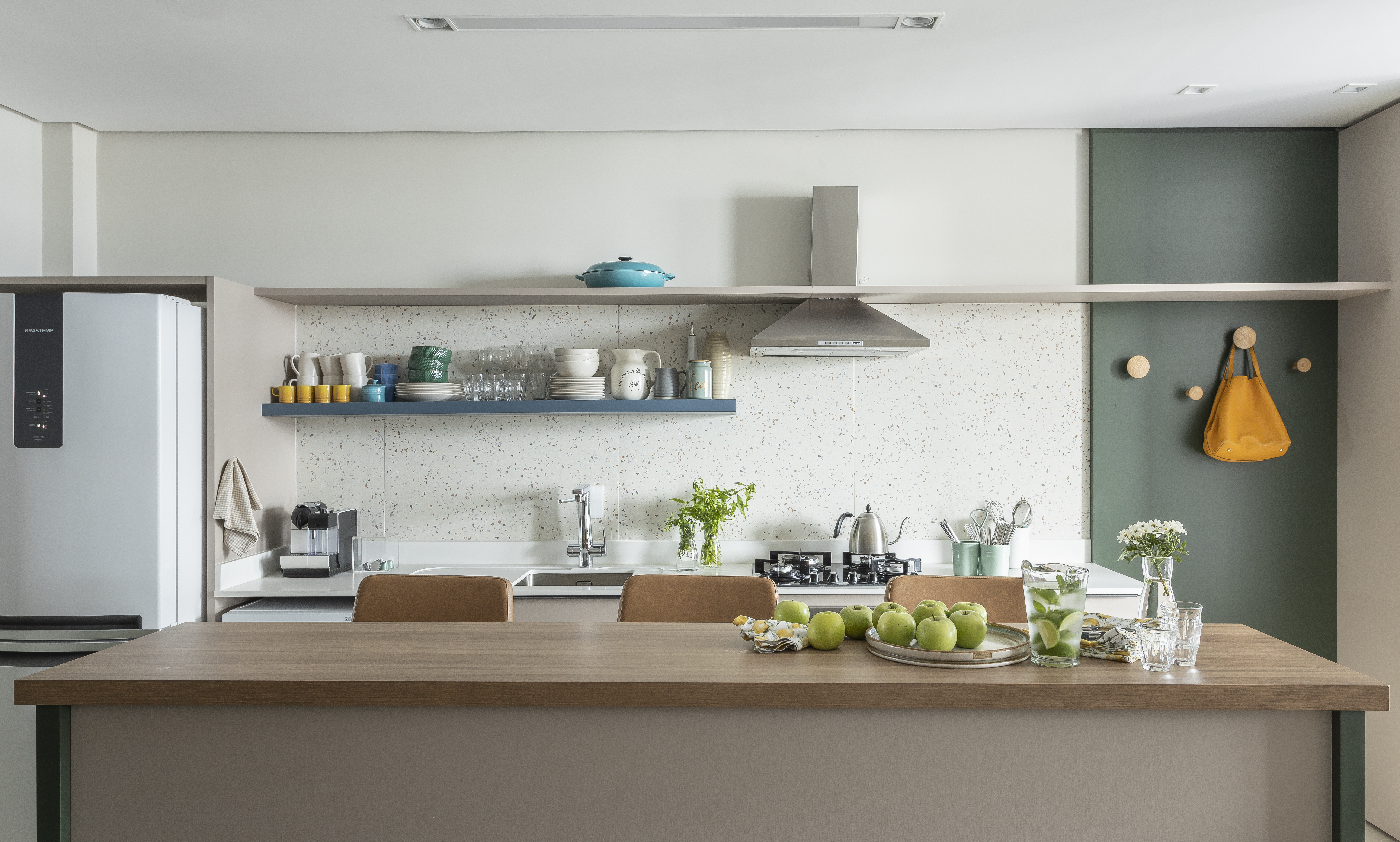 O espaço de preparo das refeições conta com armários baixos em tom areia e apenas prateleiras na parte superior preenchidas com louças e equipamentos A parede é revestida de cerâmica que remete ao granilite. O quarto, isolado do estar, possui estante com estrutura metálica grafite com nichos verde vegabo. Também faz anteparo para a cabeceira estofada em lona azul evidenciada pela iluminação de apoio.
