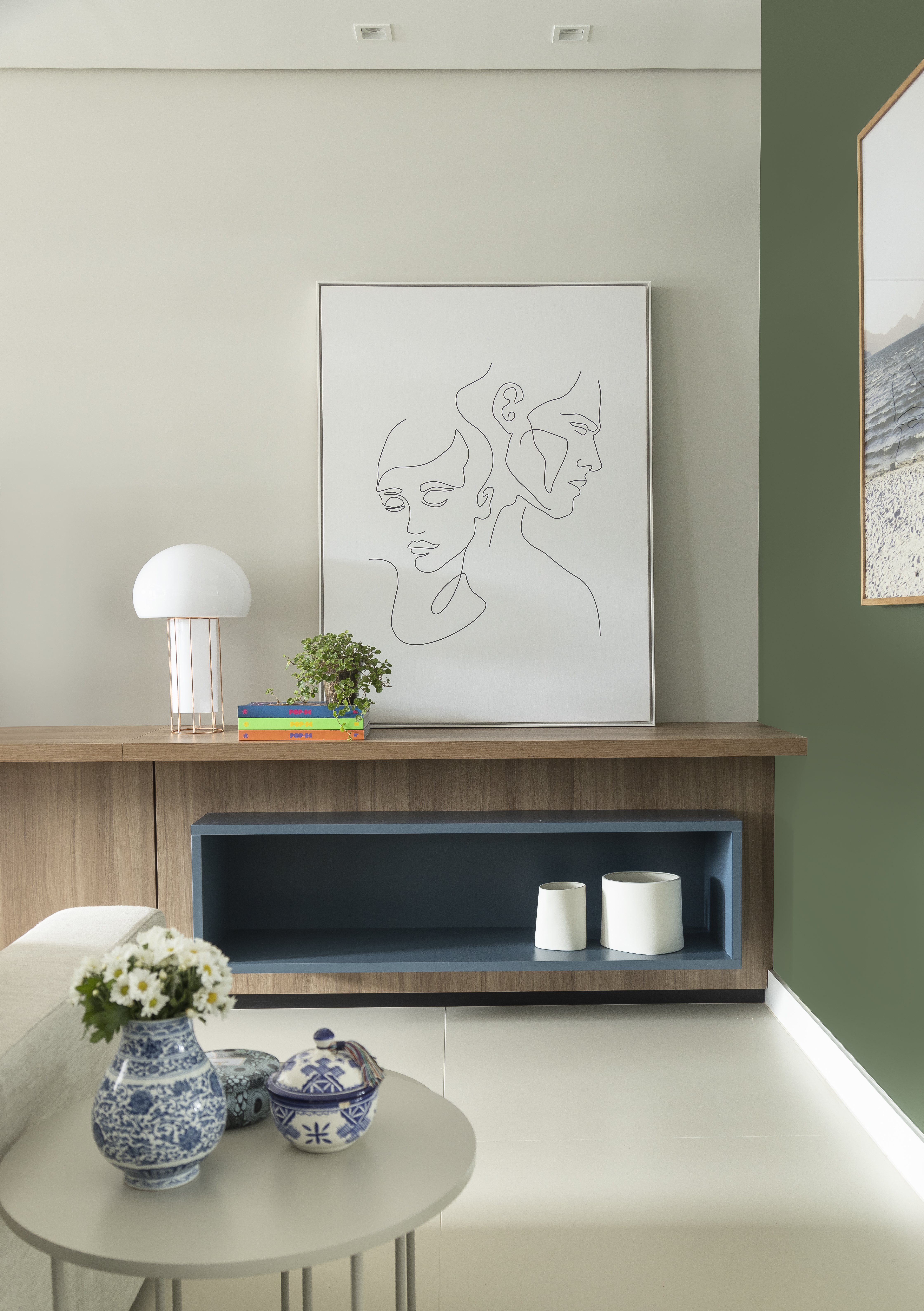 - Marcenaria fixa Luminárias – Ouse Iluminação – luminária de mesa Guarda-Chuva de Ana Neute da bancada de estudo e luminária de mesa Holofote de Cláudia Troncon na composição com a tela Elegant