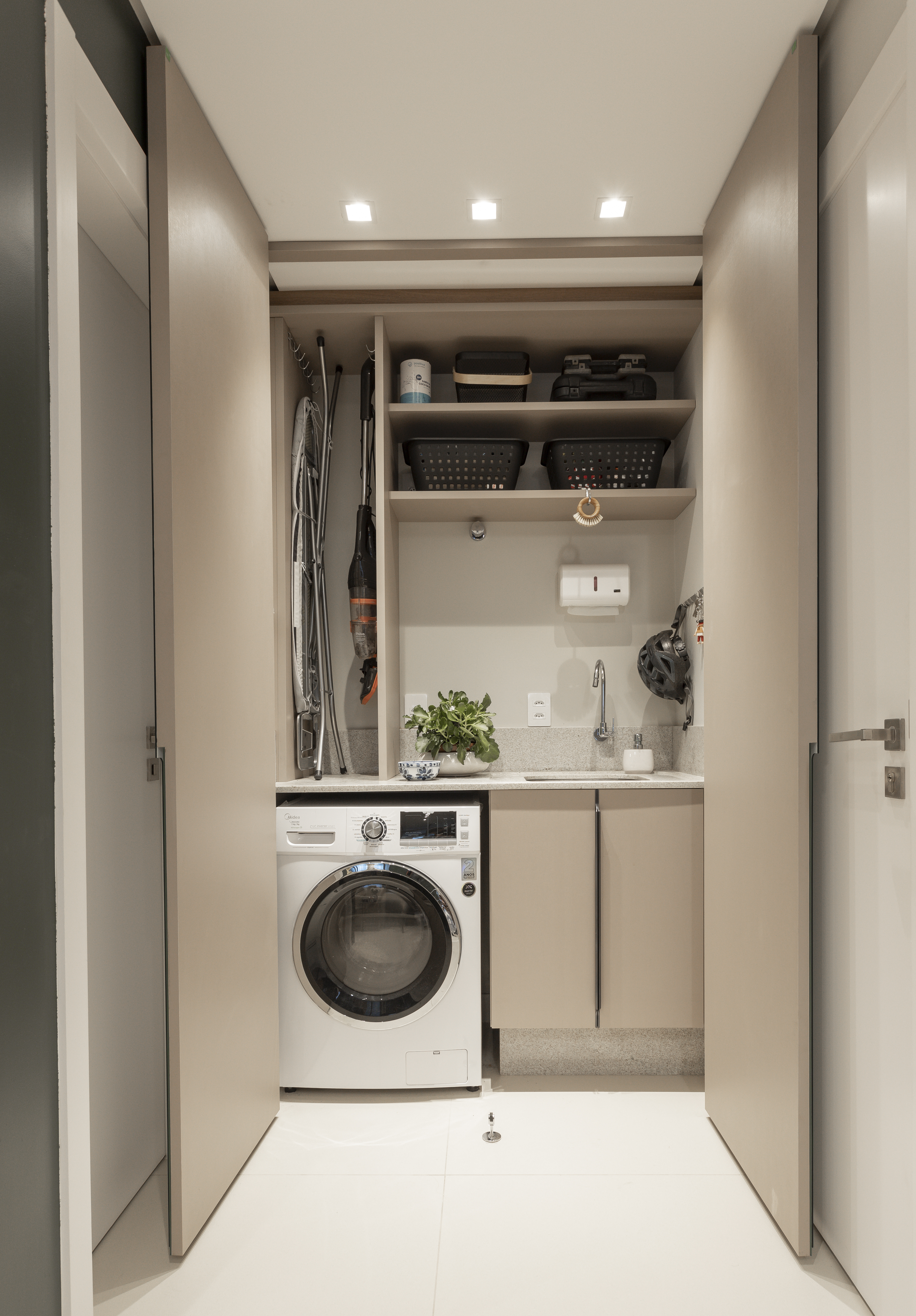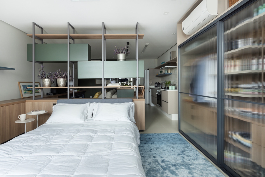 “O estúdio representa esta etapa de transição dos lares, para viver a dinâmica da cidade. Quando não está sendo utilizado pelos proprietários, é locado. Por isso trabalhei o conceito contemporâneo com divisão de ambientes, sem excessos e bloqueio de luminosidade. Pensei no morar transitório de algumas semanas para determinar a quantidade de armários de estocagem e equipamentos, sem intervenção estrutural”, comenta a arquiteta Ana Granzoto.