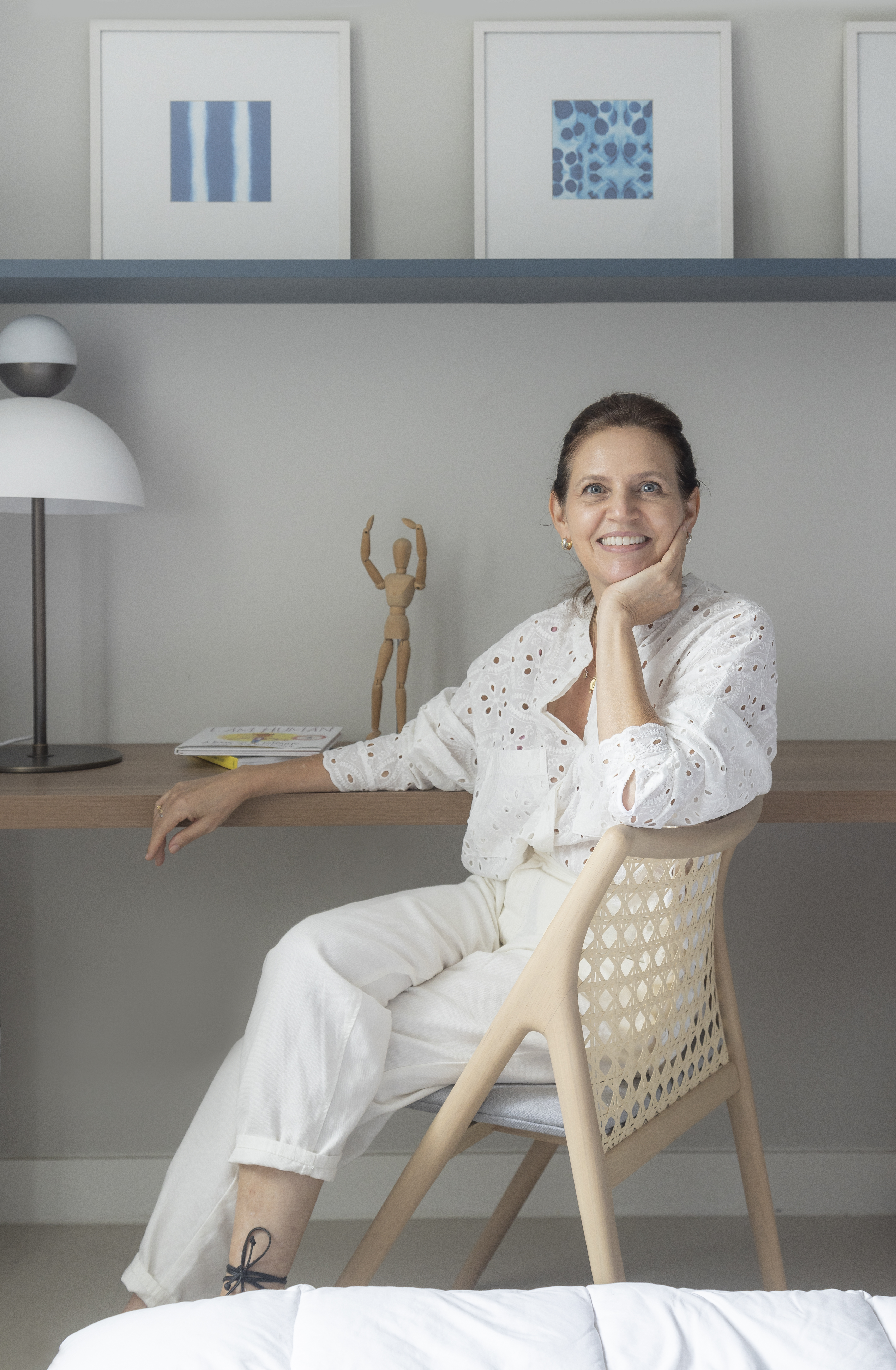 A missão da profissional, em meio à pandemia, foi transformar a metragem total em uma base acolhedora e flexível para múltiplos usos. Ana reservou mais de um terço da área privilegiada pela luz natural para montar o quarto e a área de estudo e trabalho. A divisão entre os ambientes se dá por uma estante vazada, lugar para acomodar livros e também servir de apoio para a cabeceira.