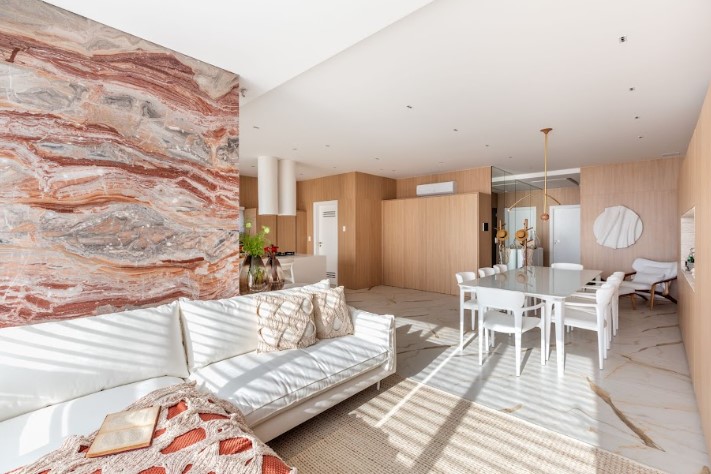 “Nosso objetivo foi criar um verdadeiro refúgio sensorial, onde cada detalhe despertasse sensação de bem-estar e conexão com o espaço. Além do mármore Orobico Rosso, outro dos pontos centrais do projeto é a cozinha com ilha, totalmente integrada à sala de jantar, pensada para que as pessoas possam cozinhar, conversar e compartilhar momentos de forma natural e fluida. É um projeto que atende tanto à proposta de moradia quanto à de casa de praia”, explica Marice.