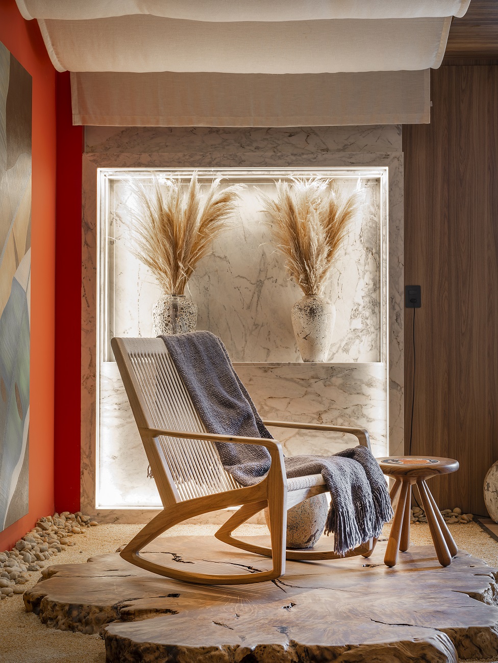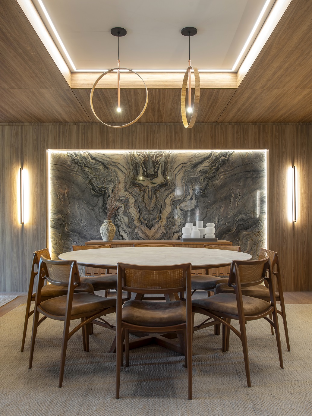 Materiais como a corda de algodão, a palha, o couro natural e madeiras como Jequitibá e Louro freijó, também tipicamente brasileiras, trazem o Brasil e suas riquezas para o ambiente. Destaque também para o mármore tipo Calacatta do qual, hoje, o Brasil é um dos maiores fornecedores”, esmiúça a arquiteta.