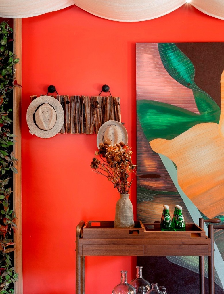 O inventário de brasilidade segue pelos 70 m² do ambiente. Natália Xavier insere a pintura da artista Lairana “Leques de Quintal” na cena com peças do designer Alfio Lisi. “A poltrona Leme esteticamente lembra uma rede, peça tipicamente indígena.O banquinho Abaporu que, não só pelo nome que é de origem Tupi-Guarani, mas também por sua estética que lembra os banquinhos usados pelo homem simples do campo em diversas regiões do país, culturalmente têm origem nos banquinhos indígenas. Além disso, especificamente este banquinho leva no assento uma xilogravura do artista de cordel J. Borges”, conta.