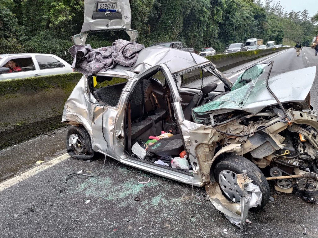 Neste domingo (28), policiais rodoviários federais atenderam um grave acidente na BR-101 em Joinville envolvendo engavetamento de quatro veículos. Um deles (Ford/Ka placas de Joinville), que ficou praticamente destruído, ferindo a passageira do banco dianteiro.