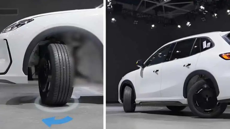 A tecnologia foi desenvolvida pela própria montadora e permite que as rodas girem 90 graus e, portanto, que o EX5 gire em torno do seu próprio eixo.