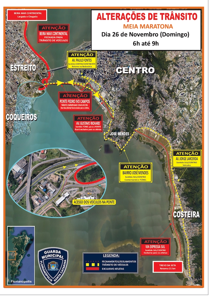 A Prefeitura de Florianópolis, por meio da Guarda Municipal, informa que na manhã deste domingo, das 6h às 9h, terão alterações de trânsito para garantir a segurança dos atletas e a fluidez no trânsito, em virtude da realização da Meia Maratona 21K, que percorrerá diversas regiões da Capital.