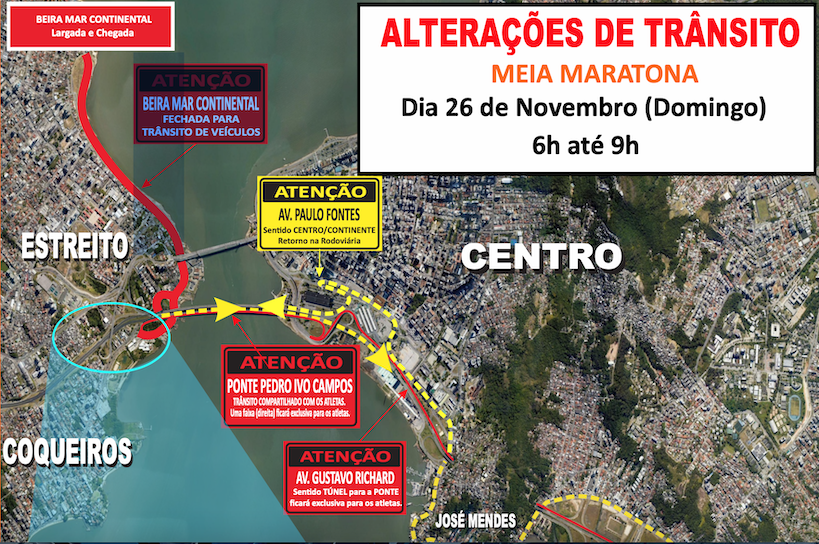A Avenida Beira-Mar Continental estará fechada para a entrada de veículos nas suas cinco entradas. Não será possível acessar a avenida pela Ponte Colombo Machado Salles, nem por Coqueiros, onde os condutores deverão realizar o desvio para acesso à ponte Pedro Ivo Campos, que estará compartilhada com os atletas.
