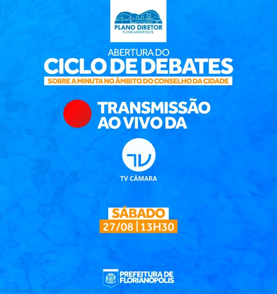 A Prefeitura de Florianópolis informa que a Abertura do Ciclo de Debates sobre a minuta no âmbito do Conselho da Cidade, o evento que apresenta a minuta da revisão do Plano Diretor, terá início a partir das 13h30 deste sábado, 27. O adiamento de meia hora acontece por conta do período de horário eleitoral gratuito.