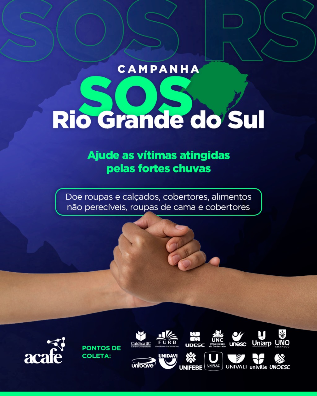 “Muitas famílias foram atingidas pelas enchentes, por isso, a ACAFE se sensibiliza e organiza uma campanha de arrecadação de donativos, a fim de prestar ajuda humanitária. Juntos, podemos ajudar a reconstruir a vida dessas famílias e oferecer o suporte necessário nesse momento difícil”, destaca a reitora e presidente da Acafe, Luciane Bisognin Ceretta.
