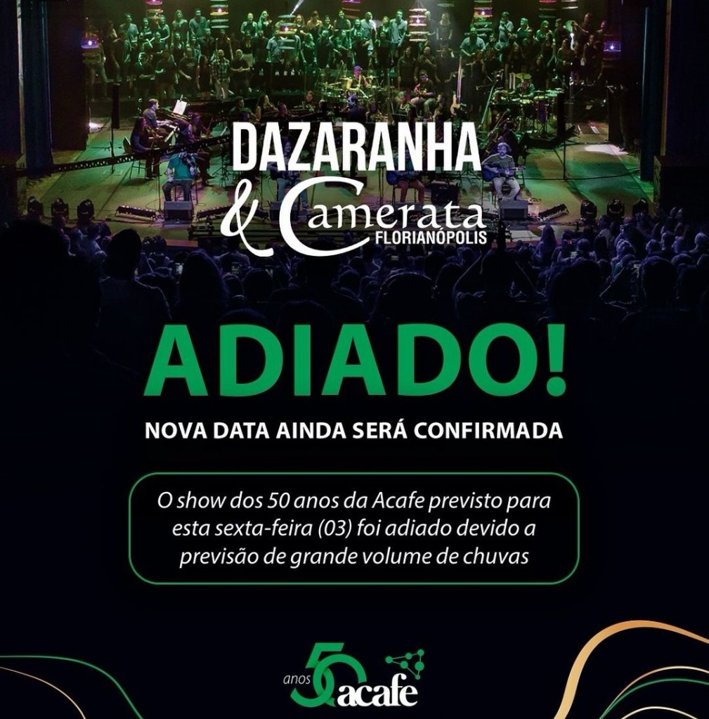 A Associação Catarinense das Fundações Educacionais (ACAFE) anuncia o adiamento do show da Camerata Florianópolis e Dazaranha em comemoração aos 50 anos da entidade, originalmente agendado para esta sexta-feira (03/5). A decisão foi tomada em consideração à previsão de um grande volume de chuvas em Santa Catarina nos próximos dias, bem como em solidariedade aos impactos das fortes chuvas no estado vizinho, Rio Grande do Sul.