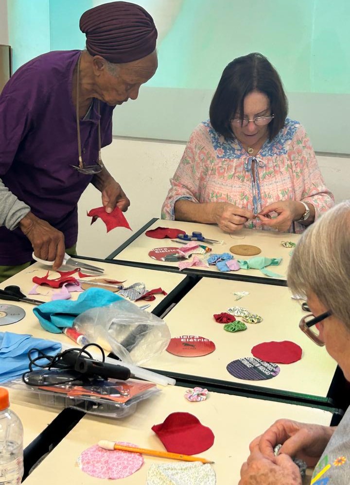 Hoje, mora sozinha e quase nunca está em casa. Três vezes por semana, está nas aulas da EJA pela manhã. Às quartas, comanda oficinas de fuxico — técnica artesanal com retalhos de tecido — tanto para os alunos em processo de alfabetização quanto para a comunidade. Participa de três grupos de teatro: no NETI, na Escola Sul em Ponta das Canas e no Instituto Federal. Faz aulas de ginástica na UFSC e, aos domingos, marca presença com seu estande na feira de artesanato da Lagoa da Conceição.