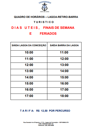 A linha possui partidas de hora em hora, com início a partir das 10h, quando começa um maior movimento na região. O último horário do dia saindo da Lagoa da Conceição é o das 18h. O quadro de horários pode ser visualizado na tabela abaixo: