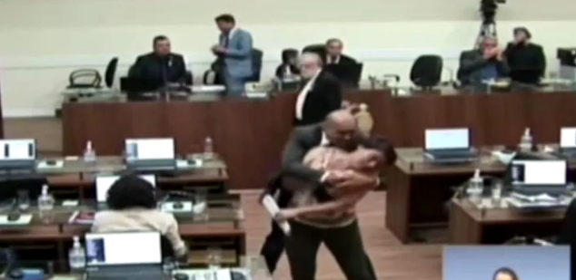 Carla Ayres (PT) foi agarrada a força pelo vereador Marquinhos (PSC) - Foto: Internet/Reprodução