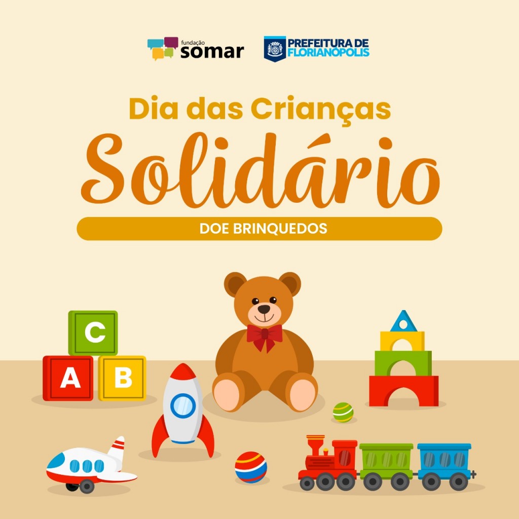 A Fundação Somar, rede solidária da Prefeitura de Florianópolis, está arrecadando brinquedos novos e usados em bom estado para a campanha “Dia das Crianças Solidário” até o dia 04 de outubro. O objetivo é levar um pouco de alegria para a data comemorativa, 12 de outubro, às crianças em vulnerabilidade atendidas por instituições sociais do município.