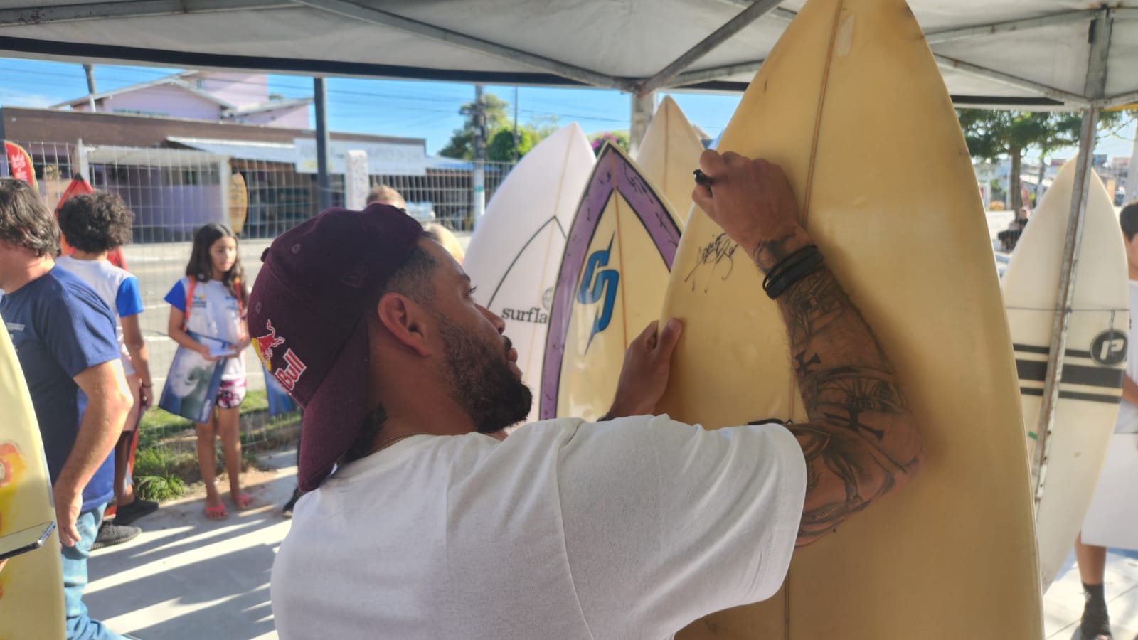 Mineirinho conversou com os estudantes, tirou fotos, deu autógrafos e aproveitou para contar um pouco da sua história no surf