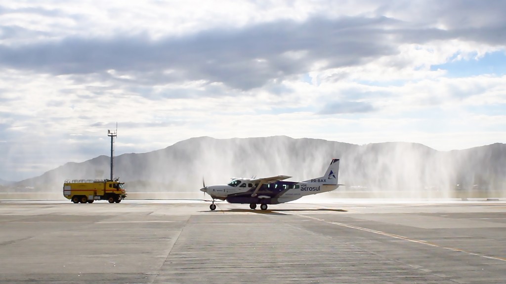 Pousou às 9h50min desta quarta-feira, 16, no Aeroporto Internacional de Florianópolis, o voo inaugural da rota Florianópolis - Curitiba, operado pela cia aérea regional Aerosul. A Floripa Airport celebrou a nova rota com water salute, batismo da aeronave com arcos de água, neste caso, realizado com água de chuva armazenada no aeroporto. No desembarque, os passageiros foram recebidos com cupcakes personalizados do voo e mensagem de boas-vindas.