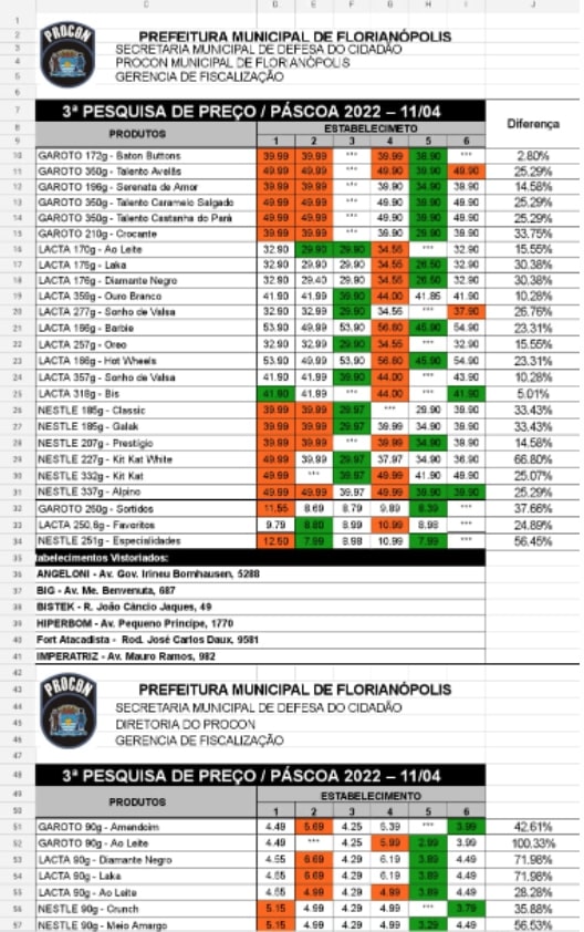 A pesquisa incluiu ovos de páscoa, caixas de bombons, e barras de chocolate de vários pesos. O item que apresentou maior diferença de preço entre os produtos pesquisados foi a barra de chocolate ao leite da Garoto 90g, que está custando R$5,99 em um local e R$2,99 em outro, apresentando diferença de 100,33%. Já em relação aos ovos de Páscoa, item mais procurado nessa época do ano, o produto que apresentou maior diferença de preço foi o ovo da Nestlé Kit Kat White 227g, custando R$49,99 em um local e R$29,97 em outro, apresentando diferença de 66,80%. Nesta quinta-feira, 14, o Procon Municipal realizará a última pesquisa de preços de chocolates antes da Páscoa.