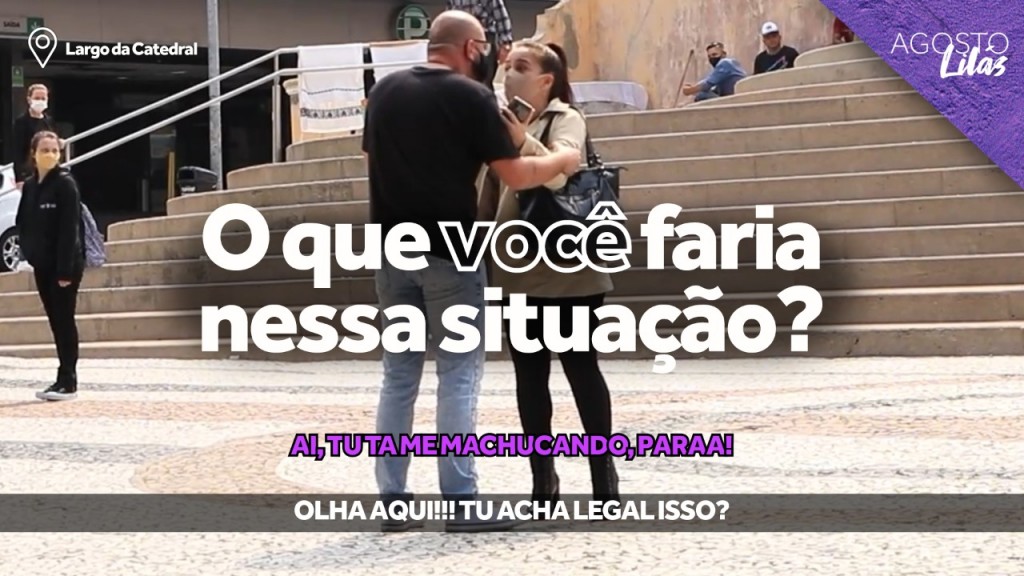 Na última semana do mês de agosto, a Prefeitura de Florianópolis, por meio da Coordenadoria Municipal da Mulher e Fundação Somar, promoveu um experimento social nas ruas do centro da cidade. A ação foi uma simulação da briga de um casal, interpretado pelos atores voluntários Leandro Cidade e Kirian Baixo, com a intenção de analisar a reação do público ao se deparar com uma cena de violência contra a mulher.