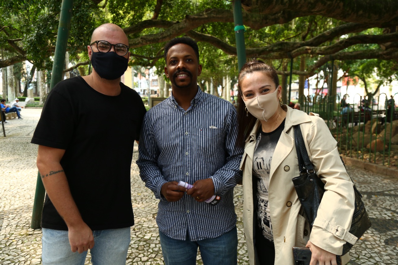 Atores Leandro Cidade e Kirian Baixo com o pedestre Abiodun Santos. Foto: Leonardo Sousa/PMF