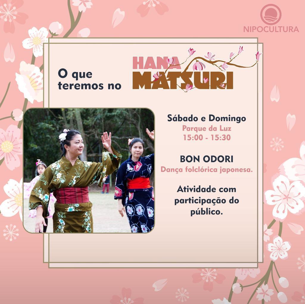 Também haverá apresentação da BON ODORI, dança foclórica que poderá ter a participação do público das 15 às 15:30 que poder tera praticipação do público.
