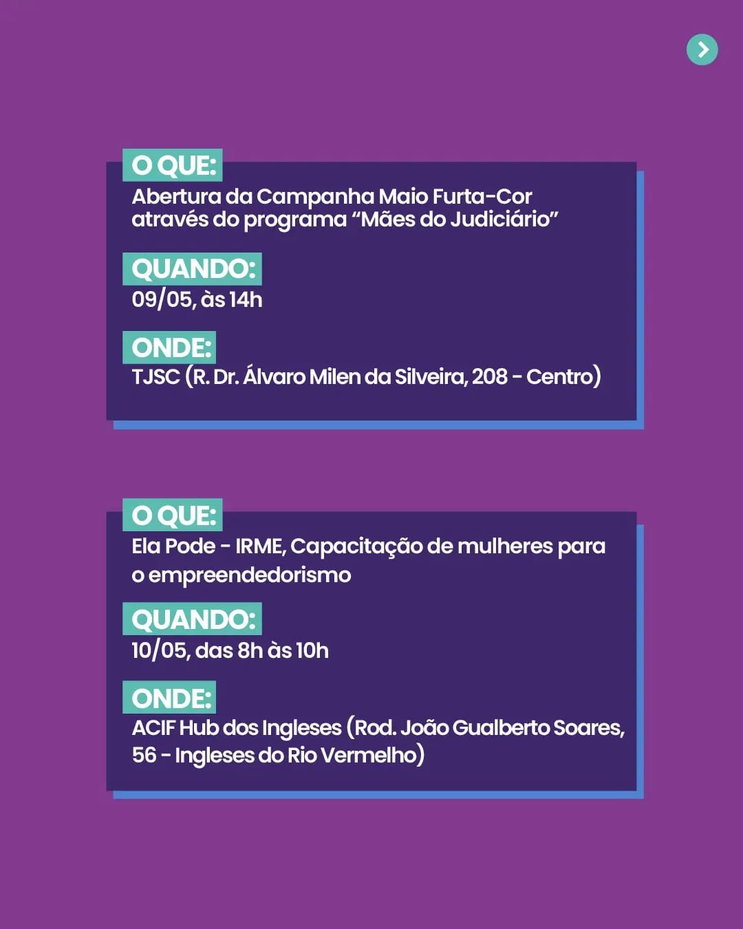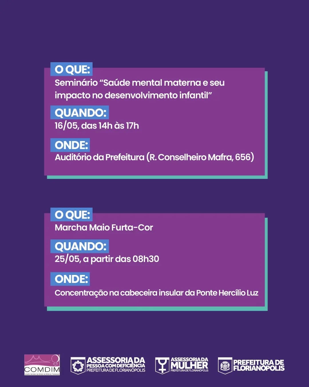 Entre as diversas ações programadas, estão as distribuições de cartilhas educativas no dia 10 de maio, entre 13h às 15h no TICEN, e no dia 11 de maio, entre 9h às 12h na Praça XV. Além disso, no dia 25 de maio, a partir das 8h30, acontecerá a marcha do Maio Furta-Cor com ponto de encontro na cabeceira insular da Ponte Hercílio Luz.