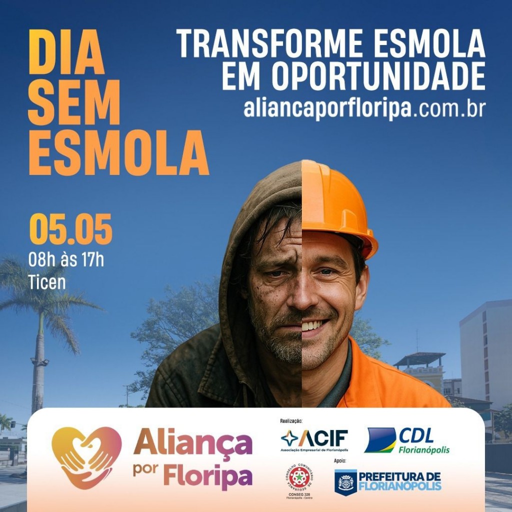 A partir deste ano, Florianópolis passa a contar com o Dia sem Esmola, iniciativa que propõe repensar a doação direta a pessoas em situação de rua. A ação ocorre em 5 de maio, das 8h às 17h, no TICEN, no Centro, promovida por CDL, ACIF e Conseg, por meio do projeto Aliança por Floripa.