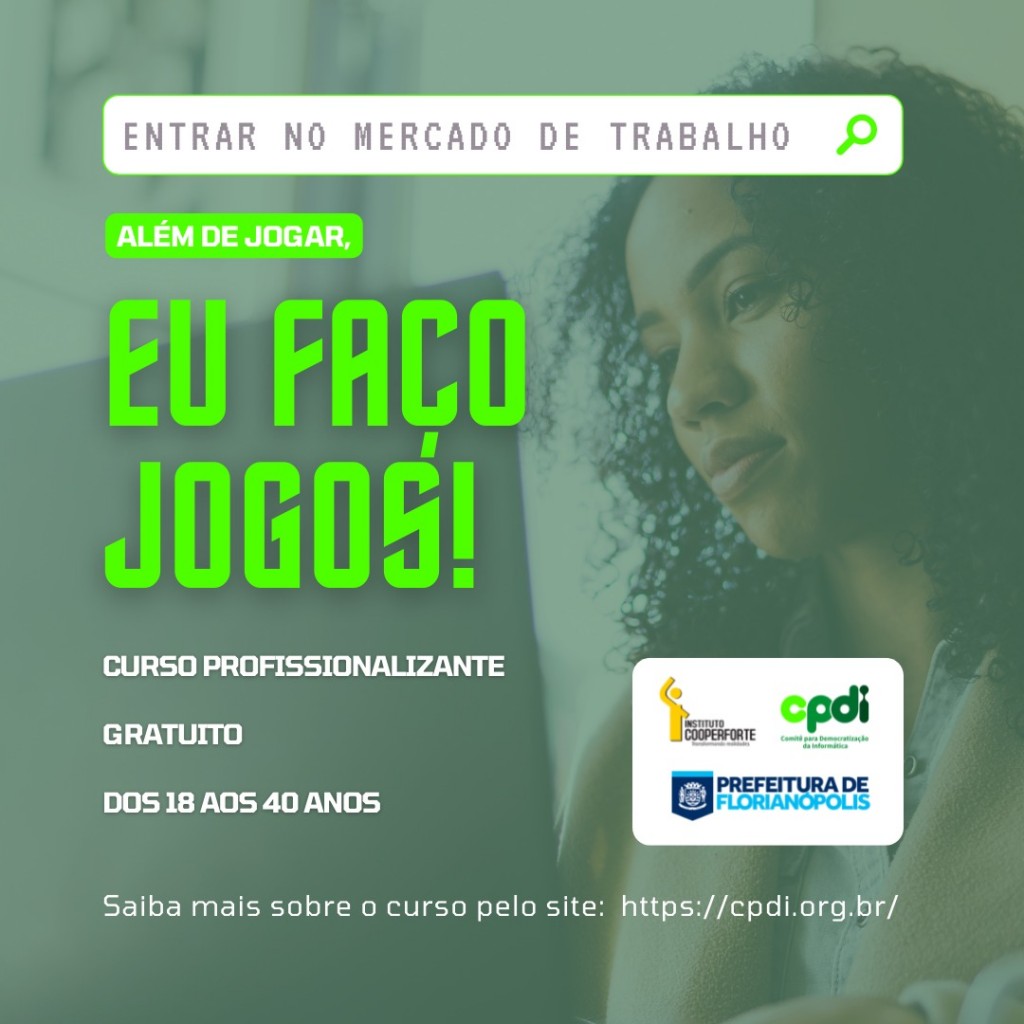 Uma iniciativa do Comitê para Democratização da Informática de SC (CPDI), em parceria com o Floripa Mais Empregos, da Prefeitura de Florianópolis, criou o curso ‘Além de Jogar, eu Faço Jogos!’, totalmente online e gratuito, voltado para o desenvolvimento de jogos e sites. O curso é focado na empregabilidade de jovens e adultos, desenvolvendo competências digitais alinhadas com as principais demandas de trabalho no setor de TI.