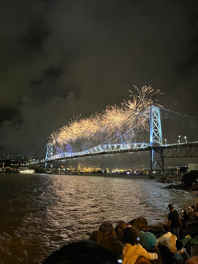 Veja a fantástica queima de fogos na Ponte Hercílio Luz inclusive com a cascata