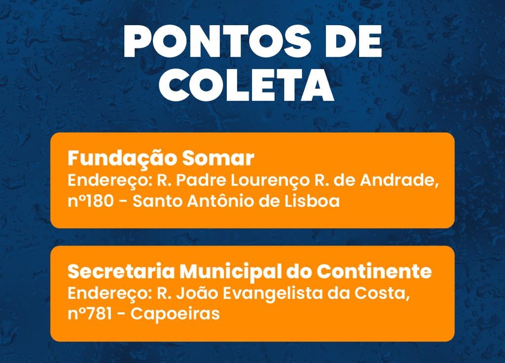 Para contribuir, os interessados devem levar suas doações até os pontos de coleta da Prefeitura de Florianópolis, que estão localizados na Fundação Somar - Rua Padre Lourenço de Andrade, n° 180, Santo Antônio de Lisboa - e na Secretaria Municipal do Continente - Rua João Evangelista da Costa, n° 781, Capoeiras - que farão plantão das 8h às 17h, de segunda-feira a sexta-feira, e das 9h às 16h, no sábado e domingo.