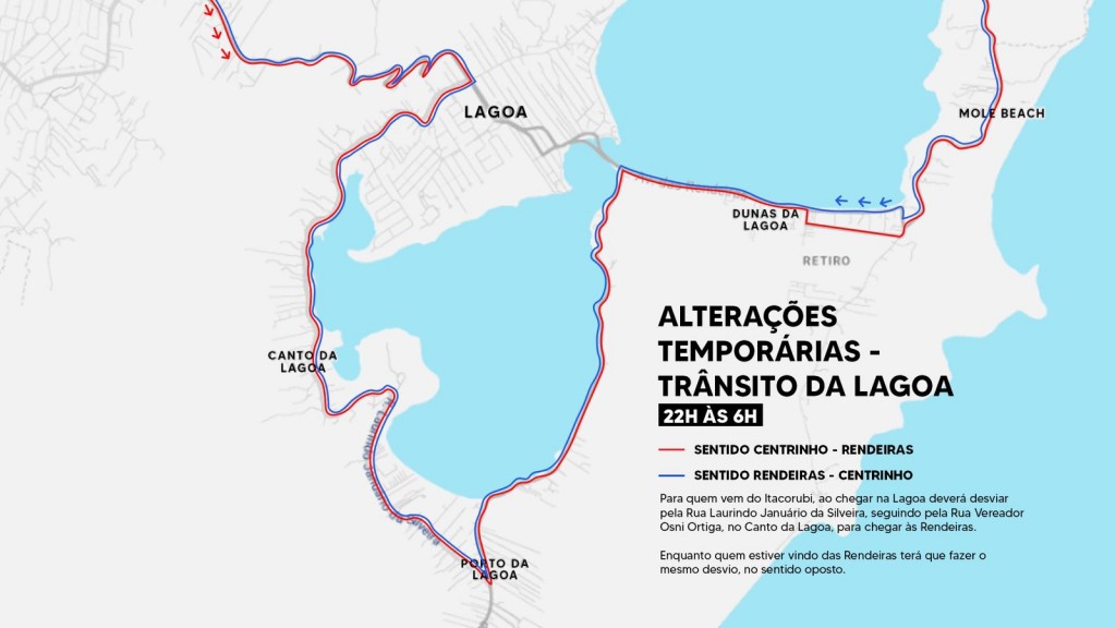 Com isso, o desvio obrigatório para quem estiver se deslocando será pelo Canto da Lagoa, utilizando as ruas Laurindo Januário da Silveira e Vereador Osni Ortiga. A mesma orientação vale para o trajeto inverso.
