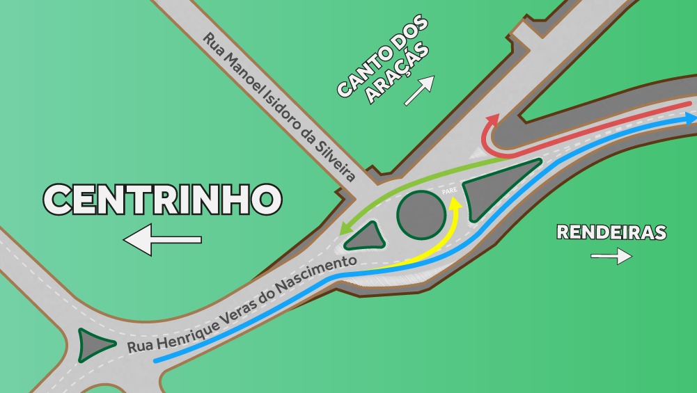 Os condutores que estiverem na Rua Henrique Veras do Nascimento e desejarem ir diretamente ao Canto dos Araçás devem permanecer na faixa da esquerda, contornando a rótula sem acessar a ponte.