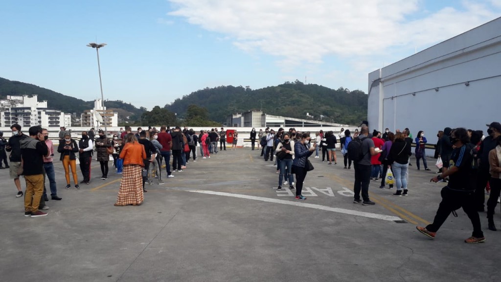 Foto no estacionamento do Floripa Shopping. - Acompanhe na TV IMAGEM DA ILHA, ao lado, a evolução das filas de vacinação nos vários postos.