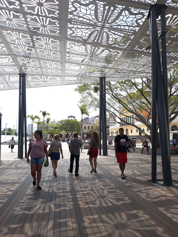 Os antigos bilros em tamanho gigante, referência ao artesanato açoriano, e que antes enfeitavam o local, foram substituídos por um espaço coberto com estrutura metálica entrelaçada, tendo como ponto a Tramóia, criada na Ilha de Santa Catarina. No ano passado, a Fundação Cultural de Florianópolis Franklin Cascaes solicitou ao Iphan que ela seja registrada como patrimônio cultural imaterial nacional. E, em dias de sol, a cobertura fará sombra em forma de renda.