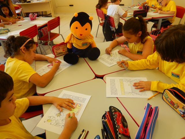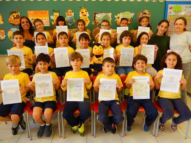 A abelha de pelúcia no meio dos alunos é o mascote de sala e a grande incentivadora do projeto