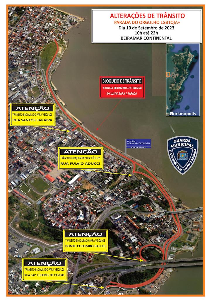 Mais uma edição da Parada LGBTQIA+ levará milhares de pessoas para as ruas de Florianópolis neste domingo (10), das 10h às 22h. Por isso, a Prefeitura de Florianópolis, por meio da Guarda Municipal, fará uma série de alterações de trânsito na região continental para que todos consigam aproveitar o evento com segurança.