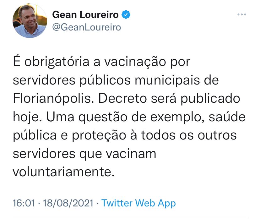 Em decreto publicado nesta quarta-feira, 18 de agosto, o prefeito Gean Loureiro tornou obrigatória a vacinação contra a Covid-19 por servidores públicos municipais. No documento, o prefeito de Florianópolis destaca que a cidade já atingiu 95% dos adultos com ao menos uma dose, mas lembra que o mundo está em atenção por conta de novas variantes, como a Delta.