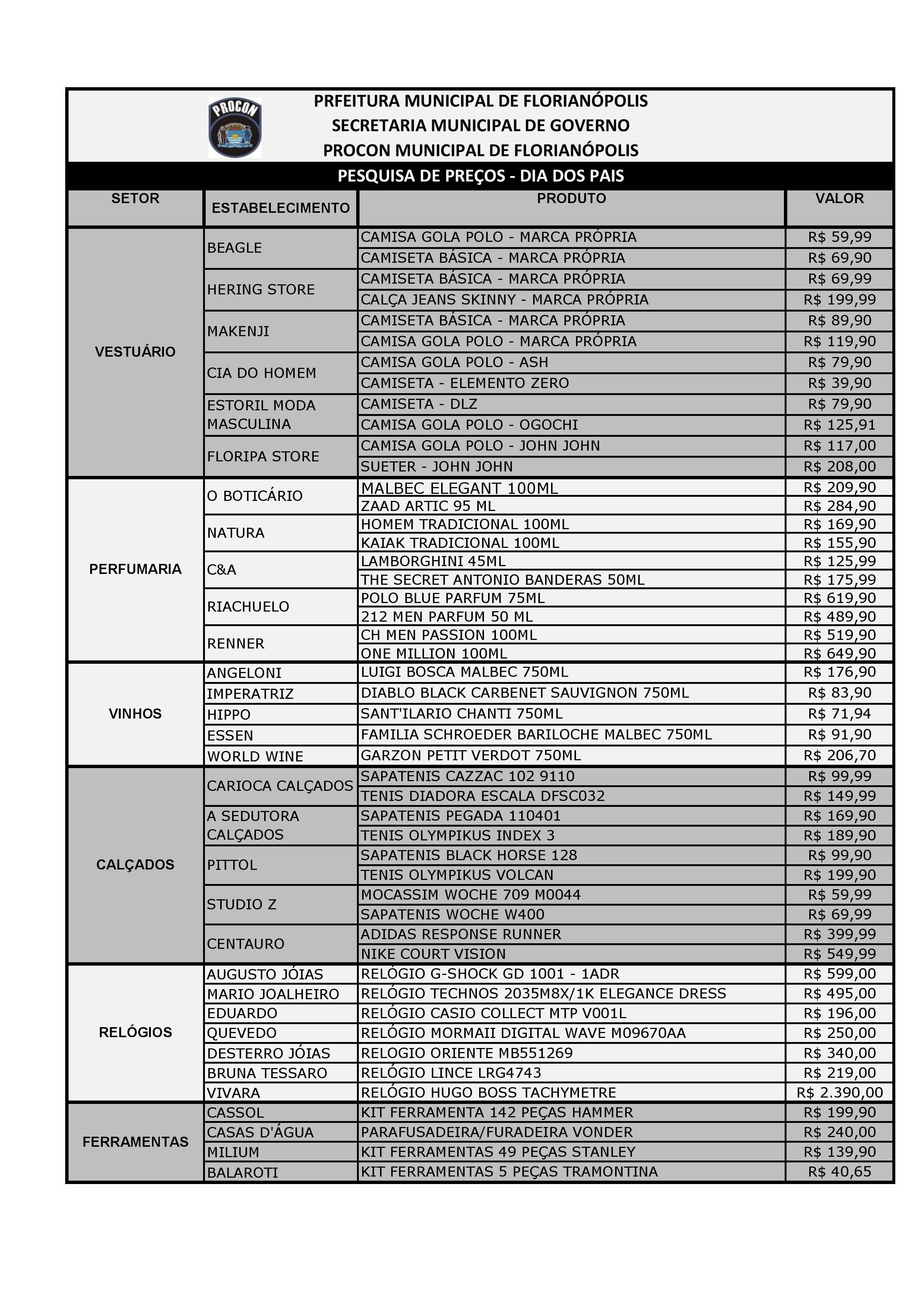 A Prefeitura de Florianópolis, por meio do Procon Municipal, divulgou nesta quinta-feira, 10, uma pesquisa de preços com os produtos mais procurados no comércio para presentear os pais no feriado do dia 13.
