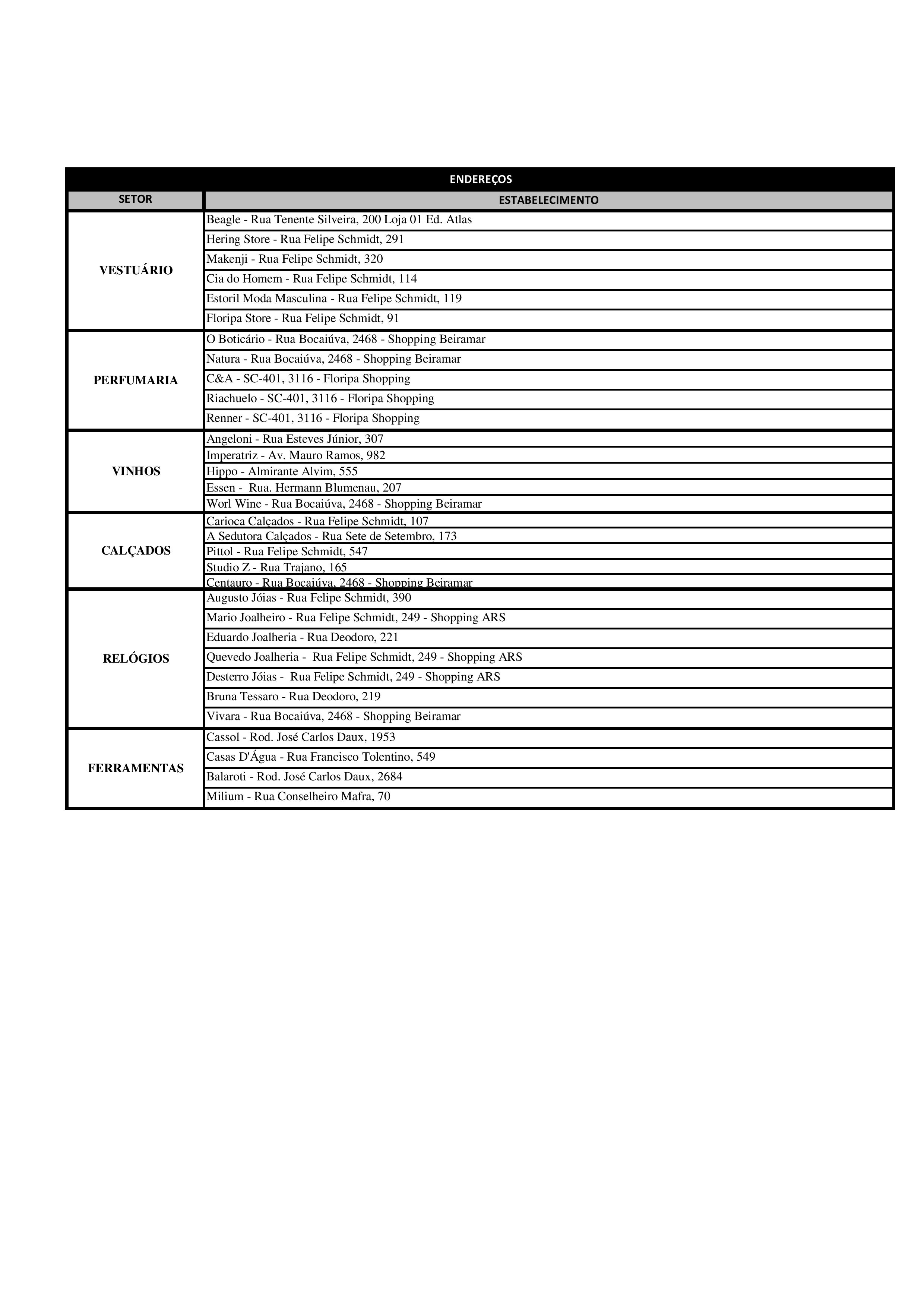 Veja abaixo o quadro com itens e valores, e no proximo a localização da loja.