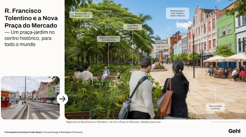 Um dos principais destaques é a criação de uma praça-jardim no entorno do Mercado Público de Florianópolis, incluindo a área da Rua Francisco Tolentino. Com cerca de 8 mil metros quadrados, o espaço foi pensado para estimular a permanência de pessoas e fortalecer o comércio local.