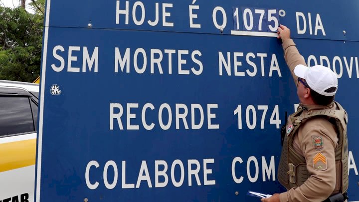 Na manhã desta quarta-feira, 16, o comandante do Posto 19 da Polícia Militar Rodoviária (PMRv), 1º sargento Paulo Sérgio Machado, acompanhado do comandante da 1ª Companhia do 1º Batalhão de Polícia Militar Rodoviária, capitão Maurício Abílio dos Santos, fez a atualização histórica do placar que contabiliza os dias sem mortes na SC-405, em Florianópolis. A rodovia superou o recorde de 1.074 dias sem acidentes fatais naquele trecho.