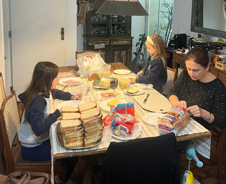 Cenara com as netas fazendo sanduiches para voluntários dos abrigos de animais.