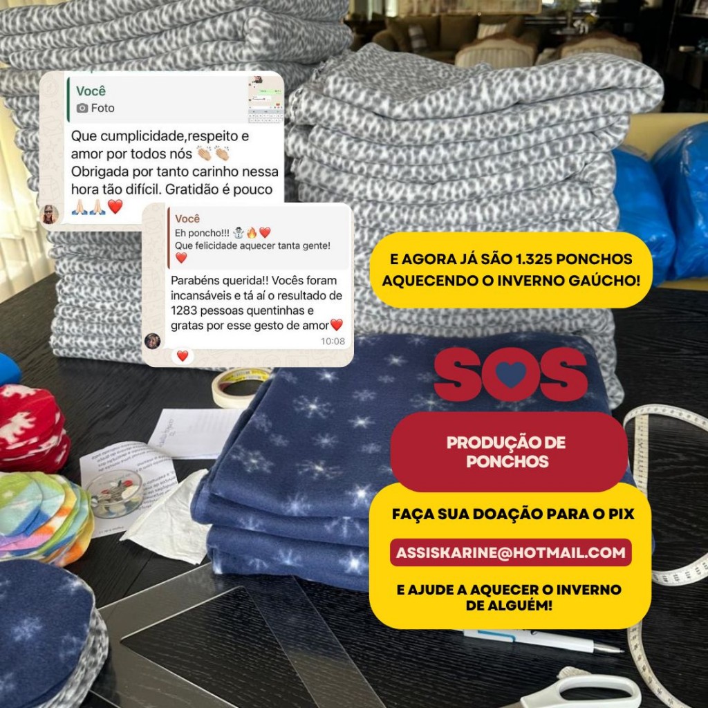 "A imagem que vem à mente é a de mãos ágeis trabalhando incansavelmente em prol daqueles que mais precisam. Esta é uma ação do bem, acima de qualquer valor material", disse Karine Assis, minha sobrinha e responsável pela gestão de recursos de doações para necessitados do RS.