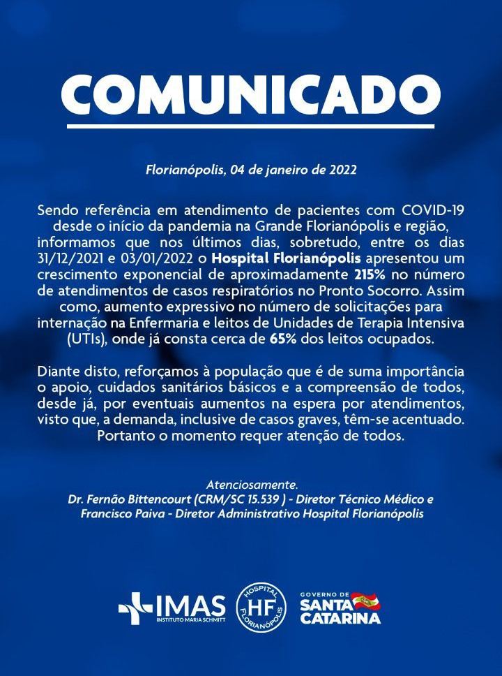 Um comunicado emitido pelo Hospital Florianópolis nesta terça-feira, 04, alerta para o surto de casos de gripe em Florianópolis. O hospital informa, que, sendo referência em atendimento de pacientes com Covid-19 desde o início da pandemia, na Grande Florianópolis e região, teve crescimento, entre os dias 31/12/2021 e 03/01/2021, de 215% no número de atendimentos de casos respiratórios no Pronto Socorro e aumento expressivo do número de solicitações para internação na Enfermaria e leitos de Unidades de Terapia ntensiva (UTI), onde consta cerca de 65% dos leitos ocupádos.