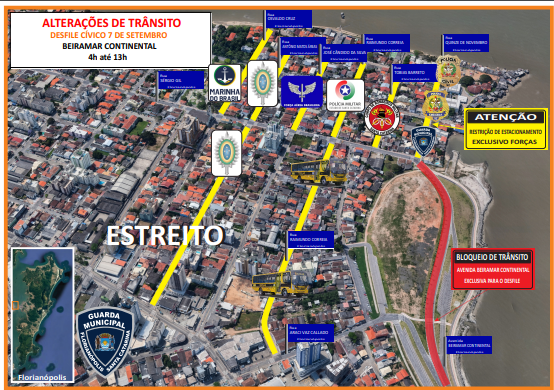 A Av. Beira-Mar Continental terá um bloqueio de trânsito e ficará exclusiva para o desfile. A passagem de veículos também não será permitida nas ruas Capitão Euclides de Castro, Fúlvio Aducci e Santos Saraiva, assim como o acesso à Beira-Mar Continental pela Ponte Colombo Salles. Outras diversas ruas do Estreito estarão restritas para estacionamento dos veículos das forças armadas.