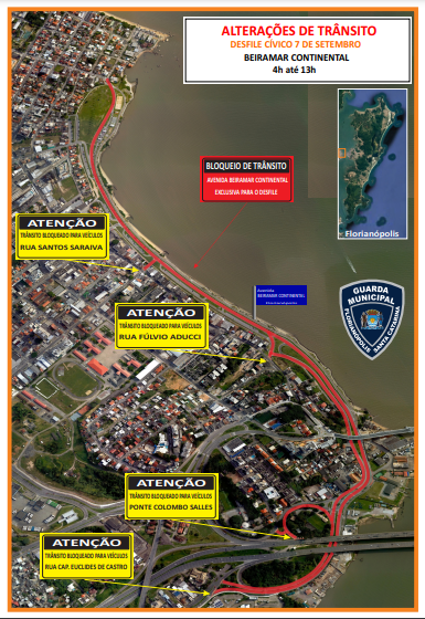Para celebrar a data da declaração de Independência do Brasil, neste feriado de quinta-feira, 07 de setembro, acontecerá um desfile cívico, na Beira-Mar Continental, em Florianópolis. Para preservar a segurança dos presentes, a Guarda Municipal realizará algumas alterações de trânsito, das 4h às 13h.