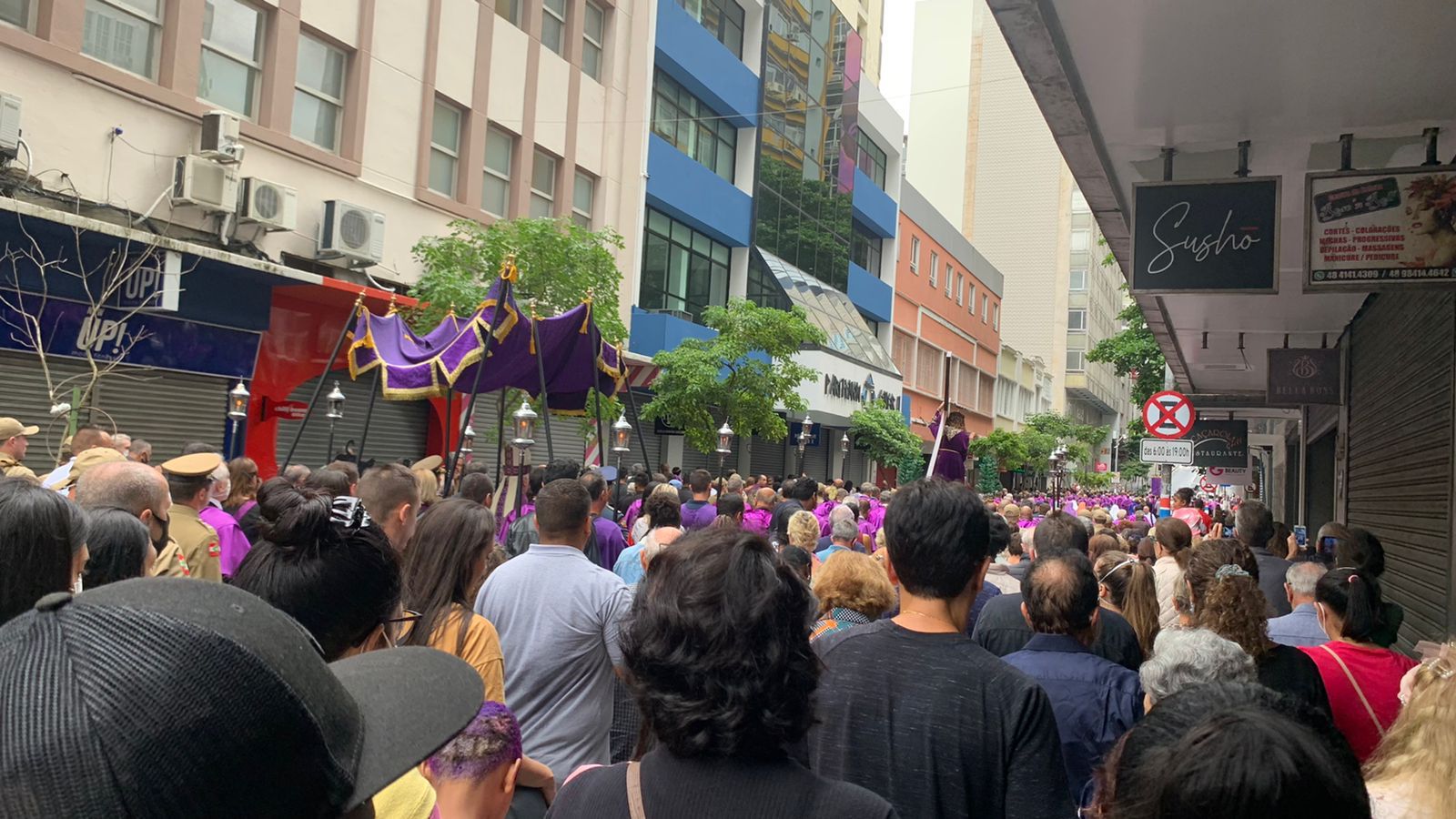 Fiéis seguindo na procissão pela Rua Ten. Silveira