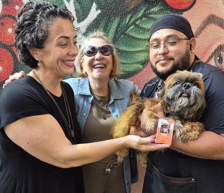 Momento fofura: pet de Juliana Wosgraus, "Max" ganhou de Tayana Pereira (e) o crachá de cliente VIP do seu BeneCafé, na Trompowsky. (Foto: Acervo pessoal)