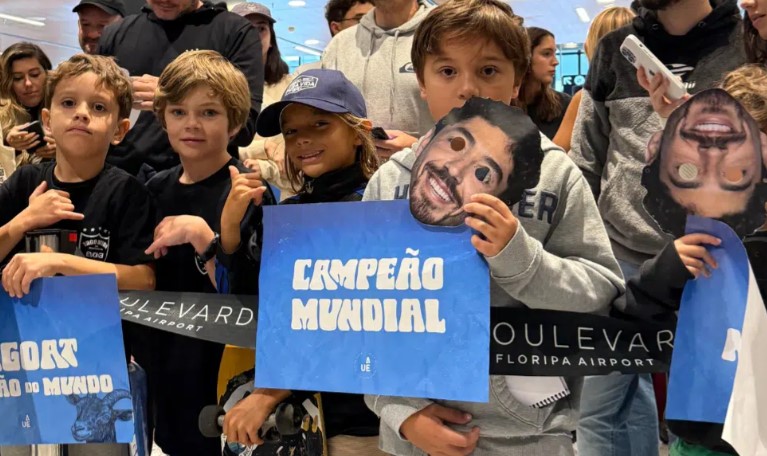 O surfista catarinense conquistou o título mundial em Fiji e foi recebido com festa na capital